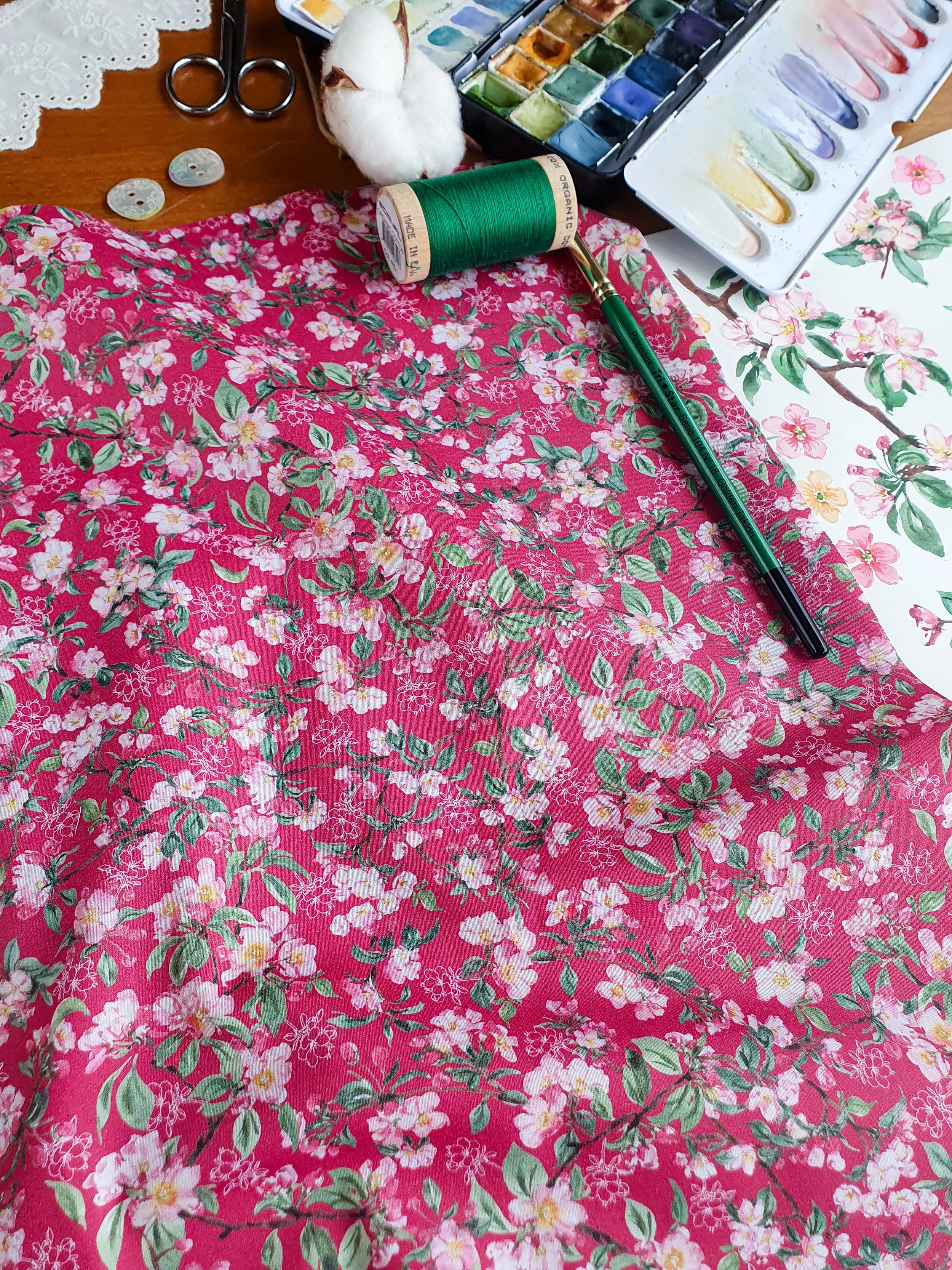 Ce motif de fleurs de pommier se déploie sur un fond bordeaux framboise profond, où se mêlent fleurs peintes et détails dessinés.