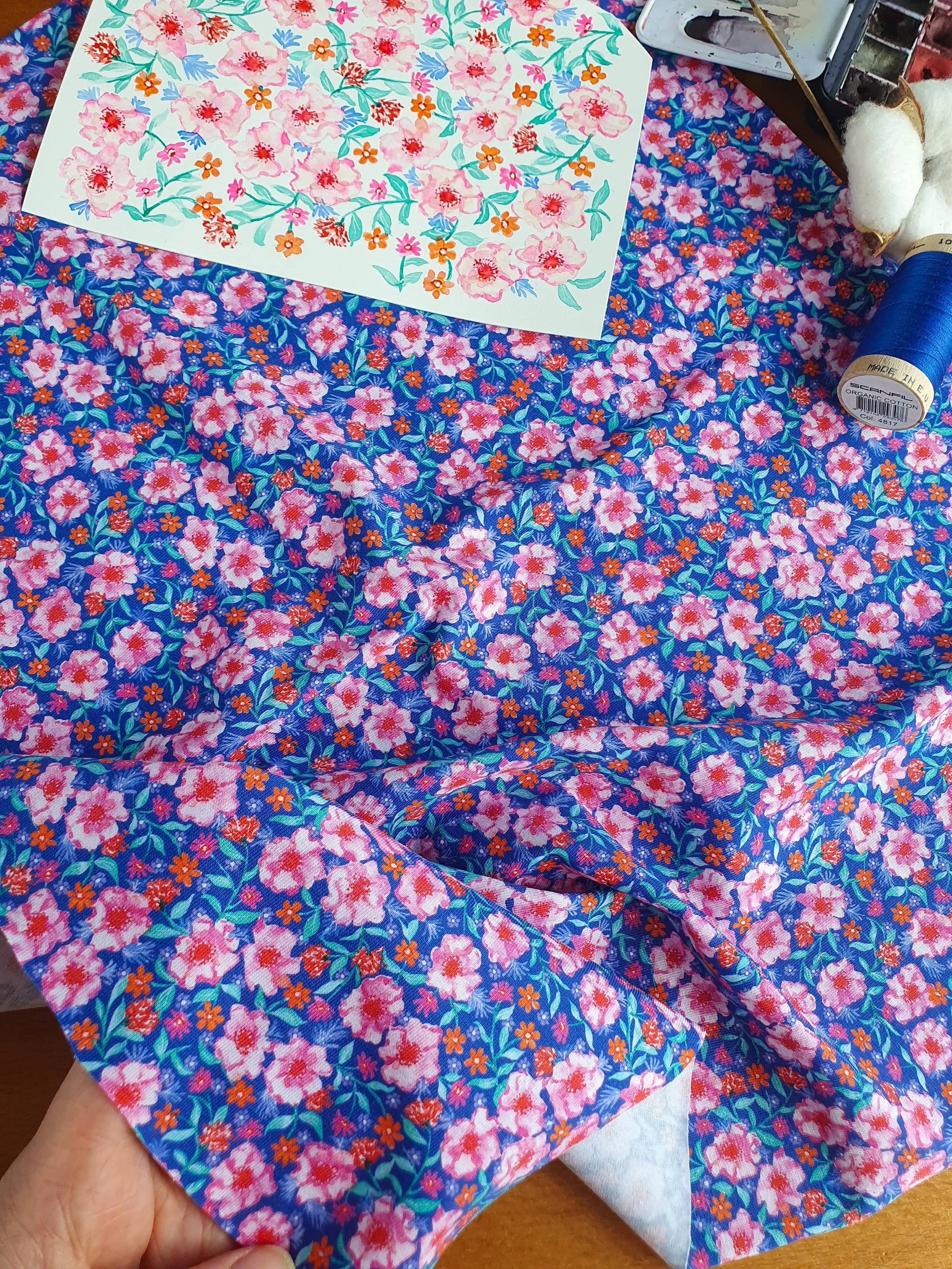 Tendresse bleutée mêle délicatesse et modernité avec ses petites fleurs roses, rouges et blanches qui se déploient sur un fond bleu électrique intense.
